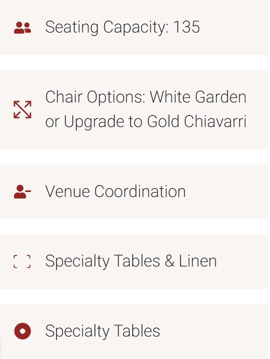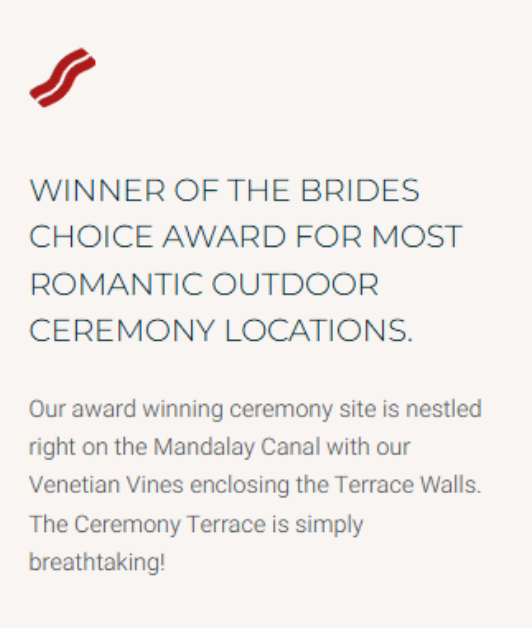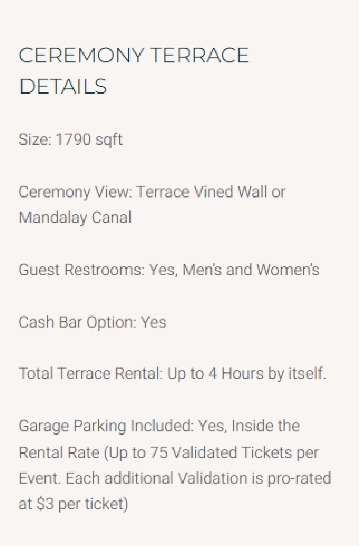 Just looking to do a Simple and Elegant Ceremony with a Lavish Cocktail and Hors d'oeuvre hour? Book our stunning Outdoor Terrace for a ceremony for up to 150 guests followed by an elegant Cocktail hour to celebrate with your guests. Our Venetian Vines climbing the Terrace Wall enclose your ceremony while the Mandalay Canal provides the perfect backdrop.